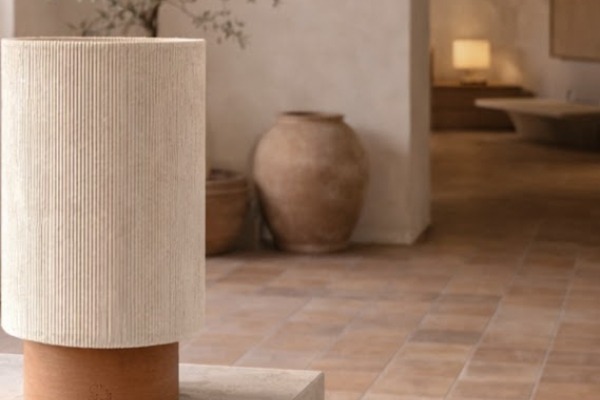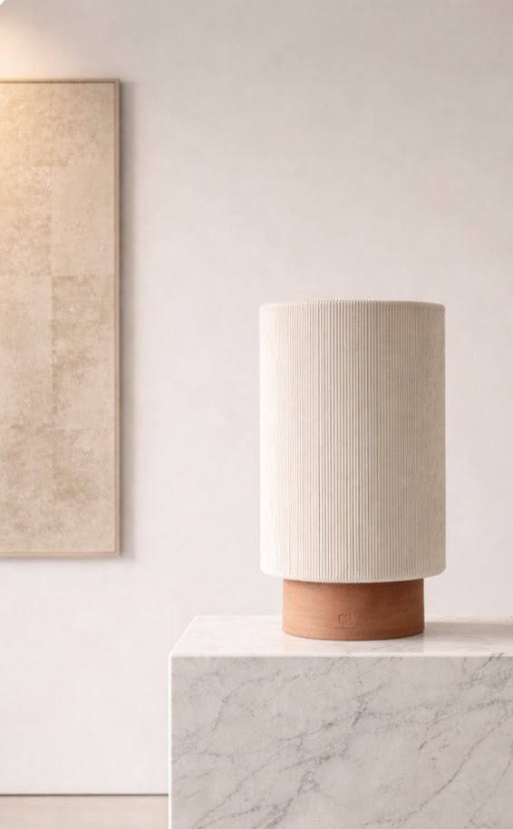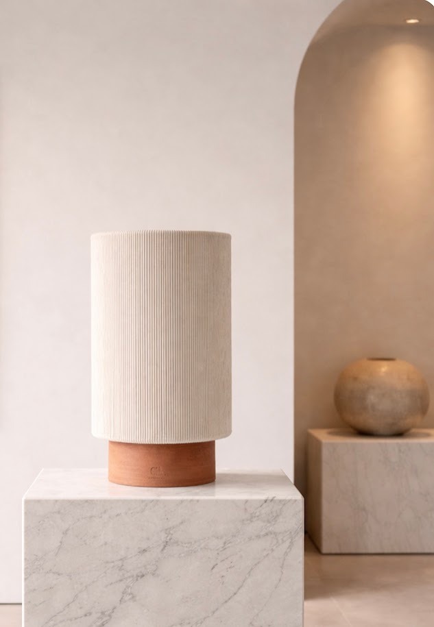 Sfeervolle lampen met voet in ruwe bordeauxrode klei en een beige lampenkap van gespannen katoendraden.