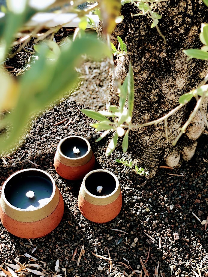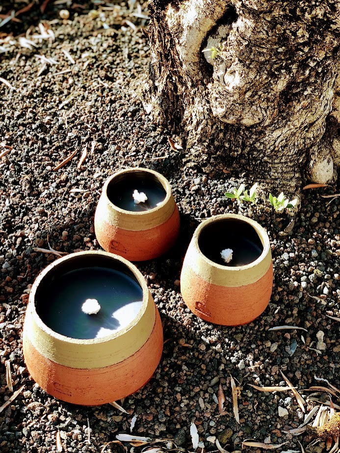 De potten van deze terraskaarsen zijn handgedraaid op de schijf met ruwe terracotta klei.